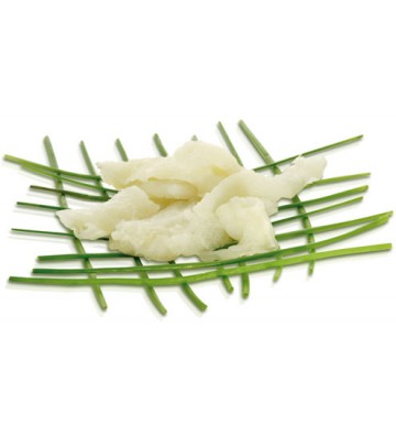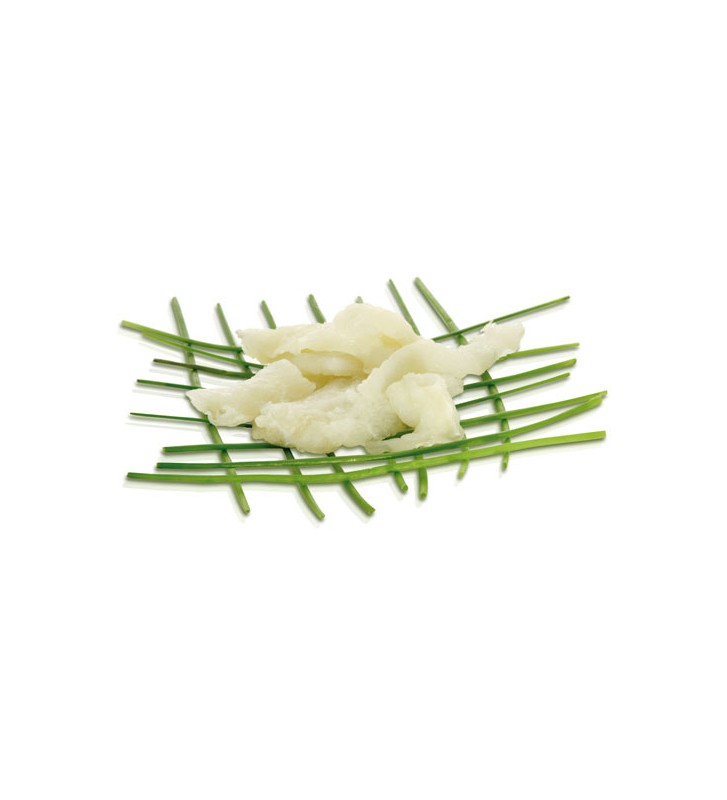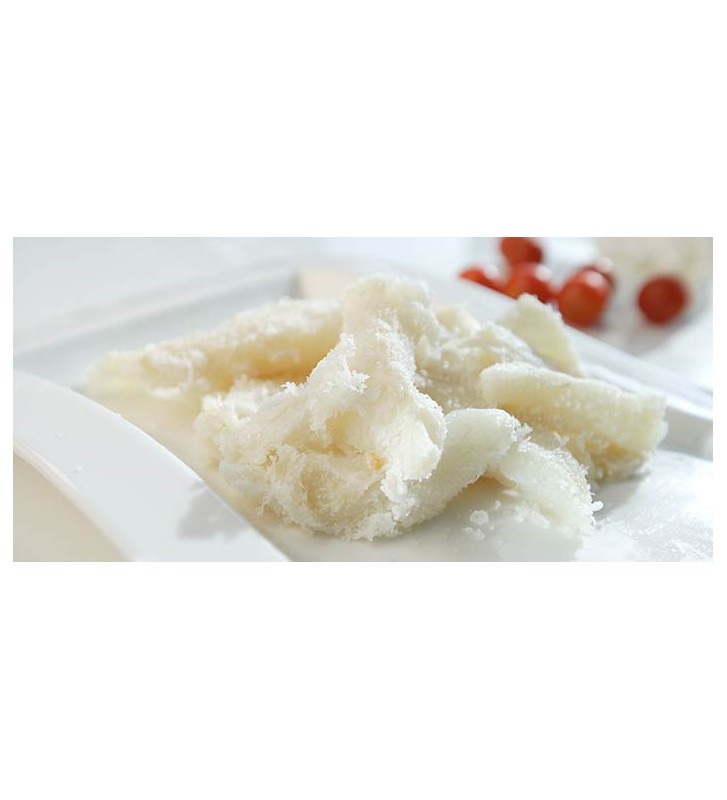 Descripción El bacalao en salazón es una forma procesada de bacalao que consiste en practicarle la desecación mediante sal (salazón). Esta presentación hace que se pueda conservar en un lugar seco durante varios meses. La pieza de bacalao curada recibe el nombre de bacalada y posee una forma casi triangular. Este tipo de bacalao está disponible en España, Italia (Baccalà), Noruega (klippfisk/clipfish) y en Portugal (bacalhau) en casi cualquier establecimiento y gran superficie. En ocasiones se confunde este pescado con maruca, brosmio, carbonero, abadejo y otros similares, máxime cuando se prepara también en salazón. En España, se prefiere el bacalao verde o de media sal o media curación. Una vez abierto, se le añade sal gorda marina y punto. Debe conservarse en frío, entre 0ºC y 5ºC, temperatura a la que está en las cámaras y a la que debe mantenerse en tiendas, restaurantes y casas particulares. A la hora de elegirlo hay que inclinarse por el de color blanco y de textura flexible. Desmigado: Trozos de bacalao sin piel y sin espinas salados y curados - 100% carne de bacalao (Gadus Morhua) blanca salada –